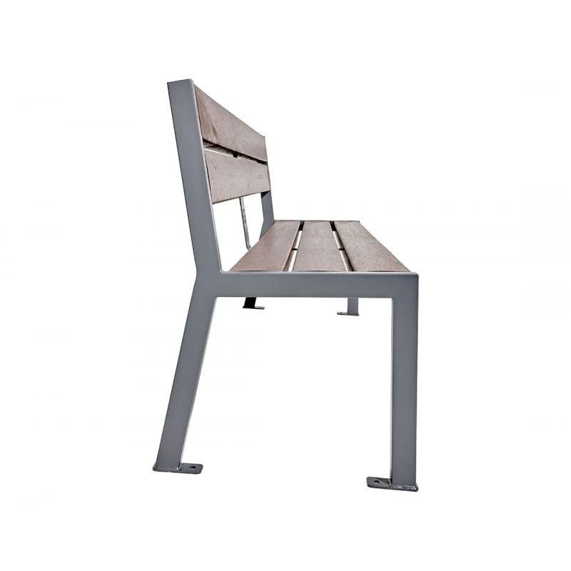 Banco de plástico sin apoyabrazos modelo Silaos, de 1.80 metros de largo. Este banco con respaldo de varios tablones a escoger (5 o 6 tablones), esta fabricado con pies de acero pintado de color a escoger y perfiles de plástico reciclado con armadura de acero. Banco sin apoyabrazos cómodo, robusto y resistente a la intemperie, ideal para parques y zonas residenciales.
